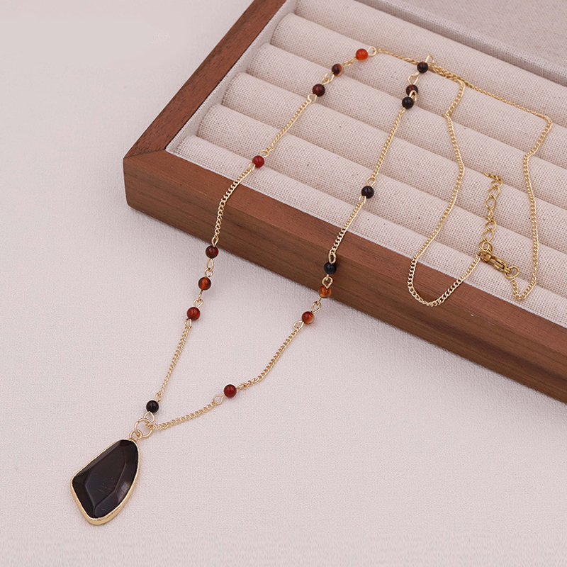 Complete your look with the Amber Stone Elegance Necklace. Featuring a gold-tone chain accented with rich amber-colored beads and a unique geometric pendant, it adds warmth and sophistication to any outfit. Lightweight yet eye-catching, this necklace is perfect for pairing with V-neck tops, flowy blouses, or simple tees for a polished finish.