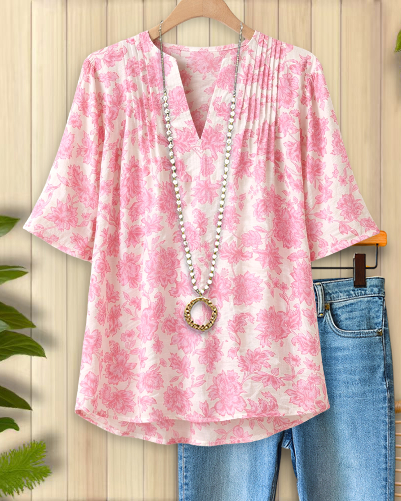 Add a romantic touch with the Blush Garden V-Neck Blouse. Featuring a flattering V-neck and flowy short sleeves, this top combines elegance with everyday comfort. The soft floral print enhances its feminine charm, while the relaxed fit makes it easy to style. Perfect for dates, brunch, or casual outings.