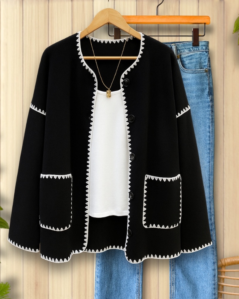 Classic with a twist! This black knit cardigan with white trim is timeless yet trendy. Cozy up in style — perfect for work, travel, or weekend coffee runs.