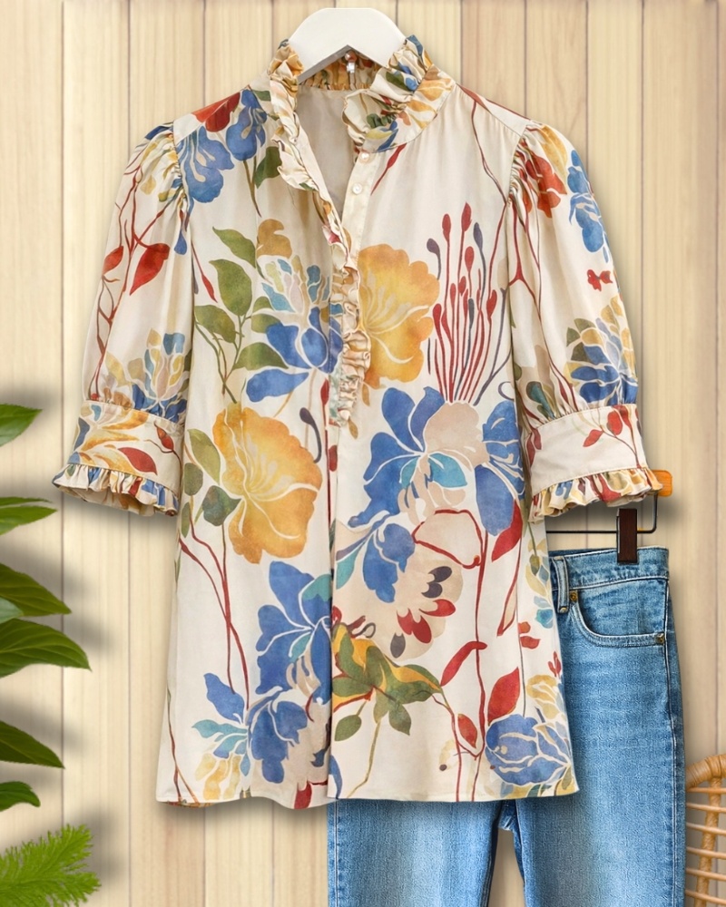 A statement piece with charming details. The ruffle collar and puff sleeves create a vintage-inspired feel, while the bold floral print keeps it modern. Perfect for dressing up denim or skirts.