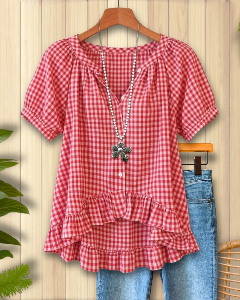 Cotton Gingham Puff Sleeve Ruffle Blouse