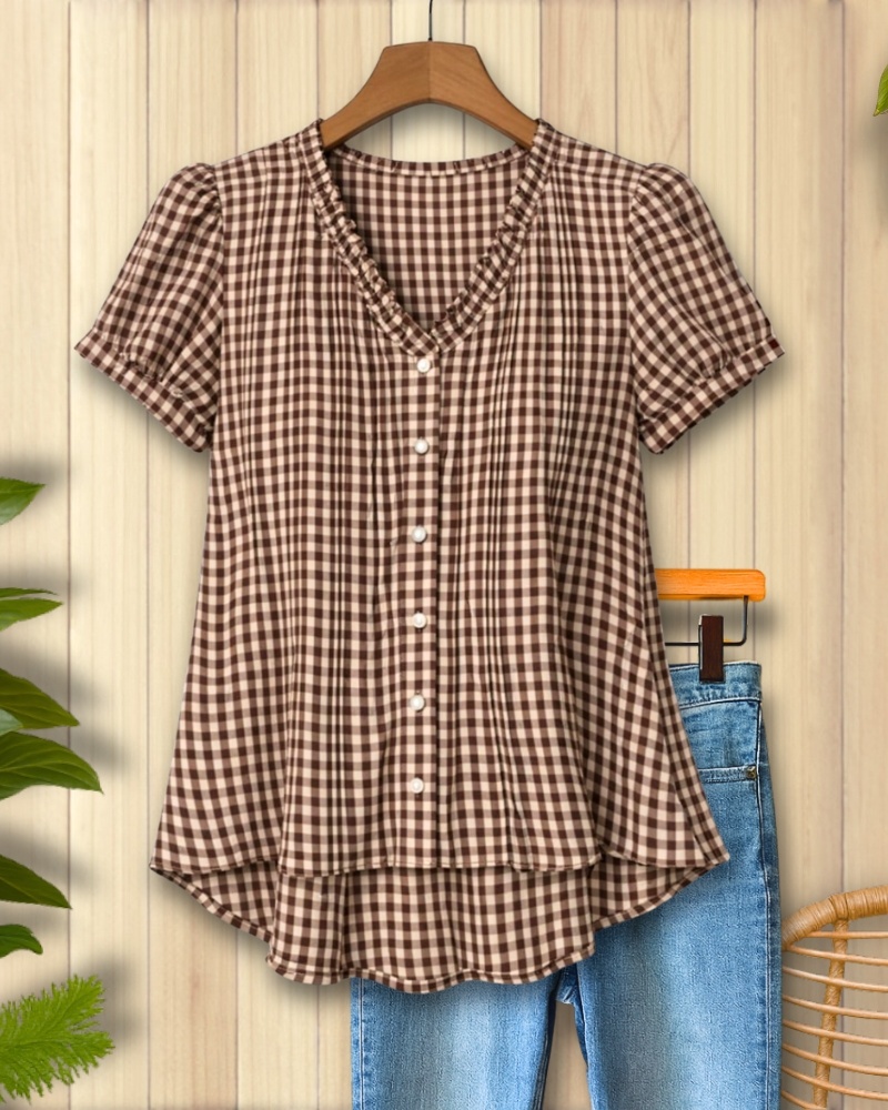 Cotton Gingham V-Neck Button Front Blouse