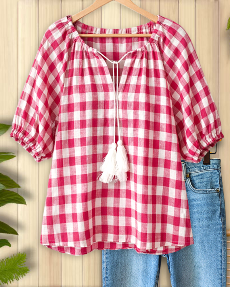 Country Charm Gingham Tie-Neck Top