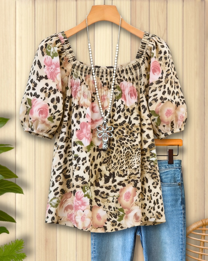 A romantic blend of floral and leopard prints, this blouse features a chic square neckline and soft puff sleeves. Lightweight and charming, it adds a sweet yet bold touch to your everyday wardrobe.