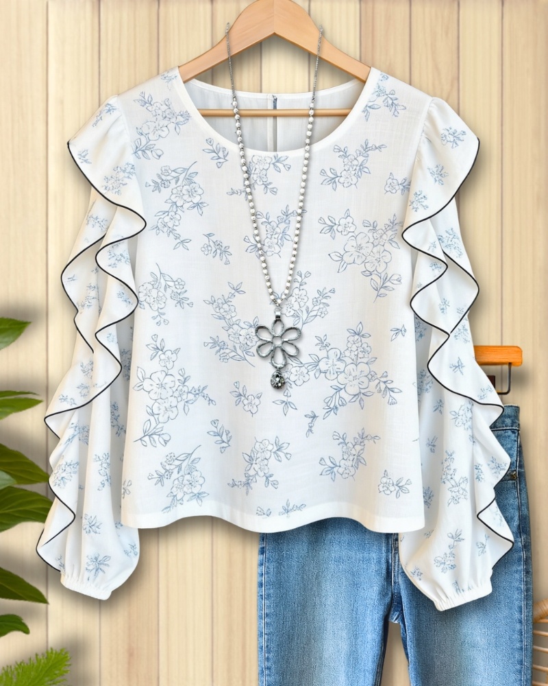 Light, airy, and effortlessly pretty. This chic floral blouse features flowy ruffle sleeves that add a soft romantic vibe. Perfect for brunch dates or sunny strolls—just pair with denim and you’re good to go.