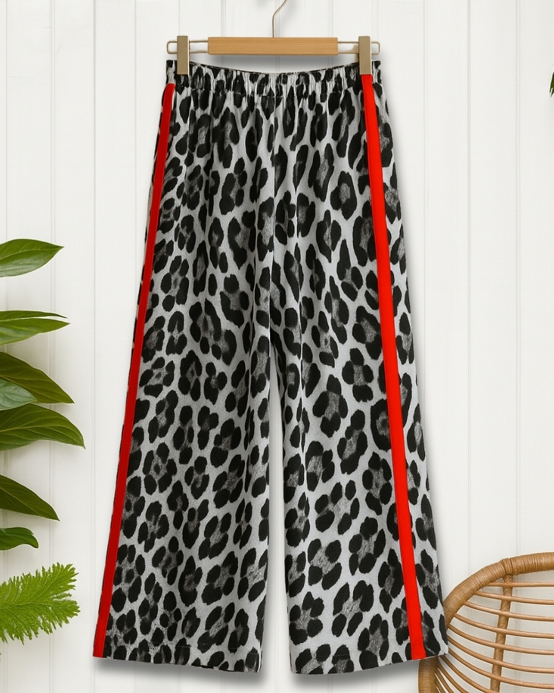 Leopard Print Wide-Leg Pants with Red Trim