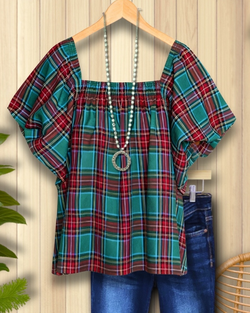 Plaid Puff-Sleeve Square-Neck Top