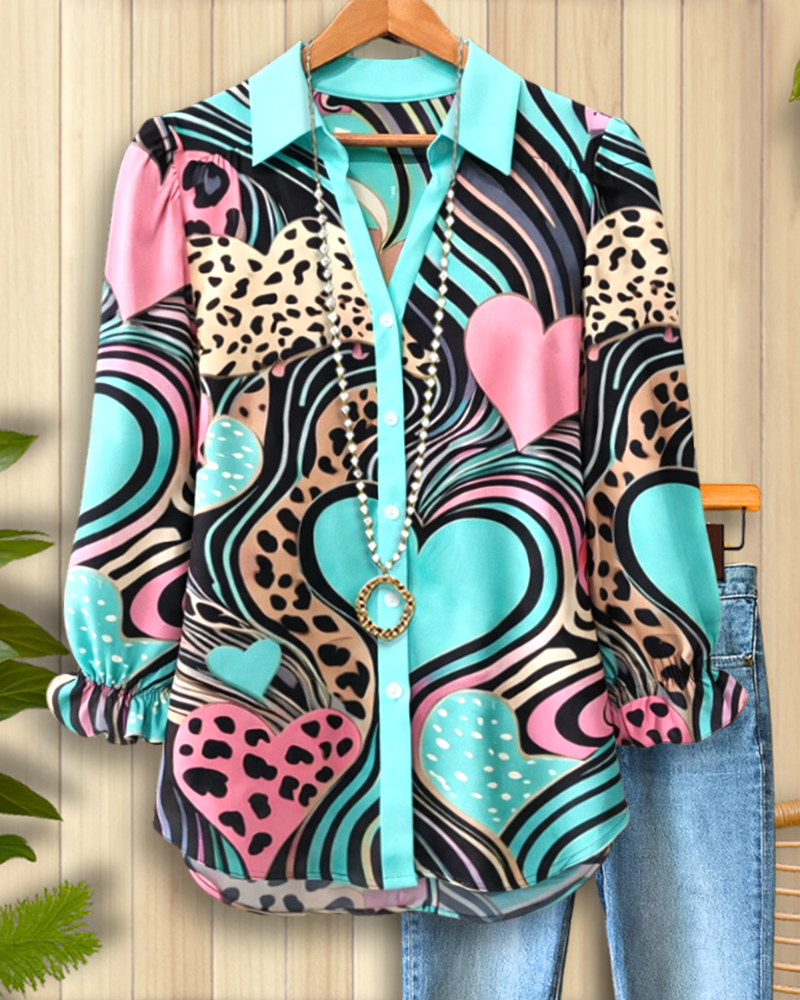 Retro Heart & Leopard Print Button Blouse