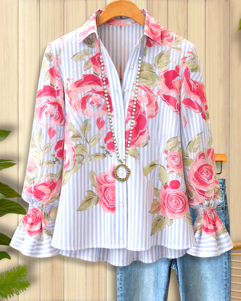 Rose Stripe & Floral Mixed-Print Button-Up Shirt