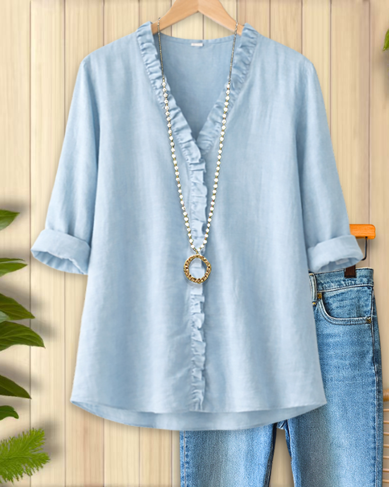 Sky Blue Ruffle Trim V-Neck Blouse