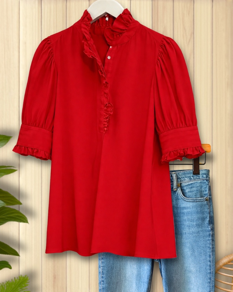 Chic, effortless, and endlessly versatile. This flowy blouse features a delicate ruffle neckline and softly gathered puff sleeves for a polished yet relaxed vibe. Dress it up with tailored pants or keep it casual with denim.