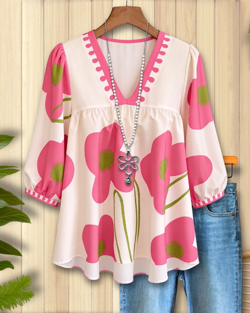 Soft, flowy, and super flattering. This blouse features bold floral prints and airy balloon sleeves. The V-neck adds a feminine touch, making it perfect for both casual days and dressed-up moments.