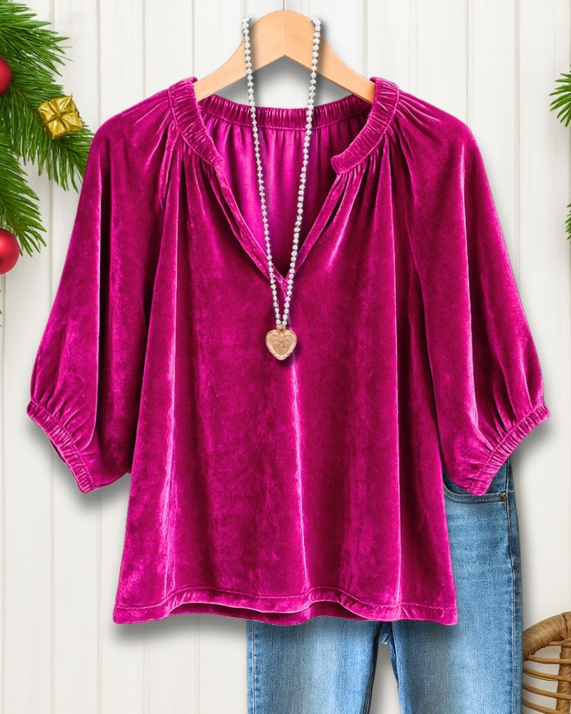 Soft, rich velvet and a gathered neckline make this blouse an instant statement. Dress it up or down for any festive moment.