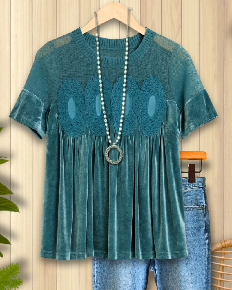 Velvet Lace-Panel Short-Sleeve Top