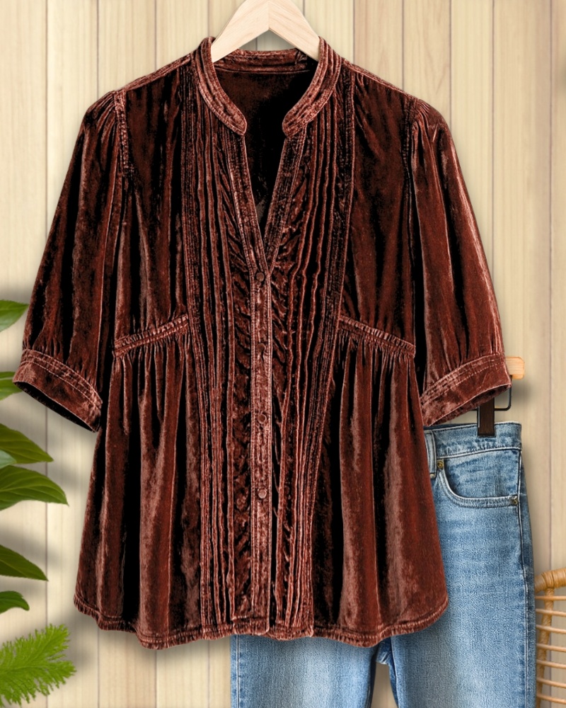 Vintage Pleated Velvet Half-Sleeve Top